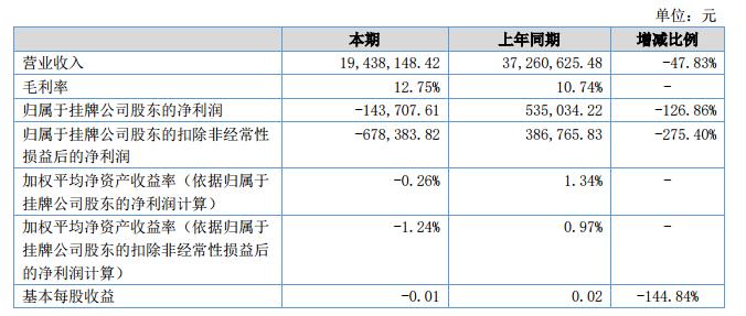 報告期內(nèi),公司實現(xiàn)營業(yè)收入1,943.81萬元,同比下降47.83%,實現(xiàn)凈利潤-14.37萬元,同比下降127.27%。?