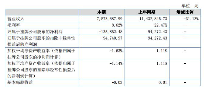 報告期內公司營業(yè)收入7,873,687.99元,較去年同期有所下降;營業(yè)成本為7,195,047.18元,與上年同期相比減少1,669,313.02元,降幅18.83%?;凈利潤為-135,852.48元?。