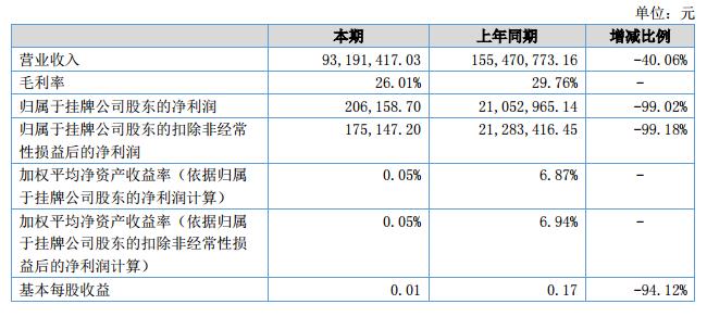 報告期公司營業(yè)收入為93,191,417.03元,較去年同期減少62,279,356.13元,減少比例為40.06%;扣除非經(jīng)常性損益后凈利潤為206,158.70元,較上年同期減少20,846,806.44元;經(jīng)營活動產(chǎn)生的現(xiàn)金流量凈額為-40,194,006.93元,較上年同期減少114,736,709.35元,減少率為153.92%。