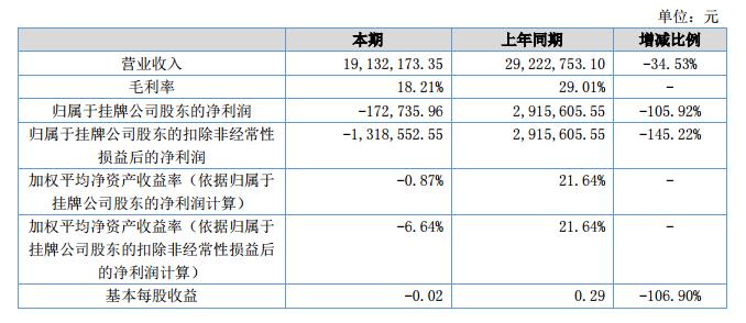 報告期內(nèi),公司營業(yè)收入為19,132,173.35元,比去年同期29,222,753.10元相比,下降34.53%;公司凈利潤為-172,735.96元,比去年同期2,915,605.55元下降105.92%。?