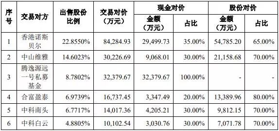根據(jù)各交易對方的出售股份比例、交易對價、對價支付方式,第一大股東將套現(xiàn)2.95億元,而騰逸源遠(yuǎn)一號私募基金將全額套現(xiàn)3.24億元。